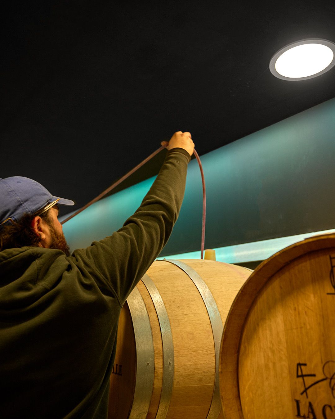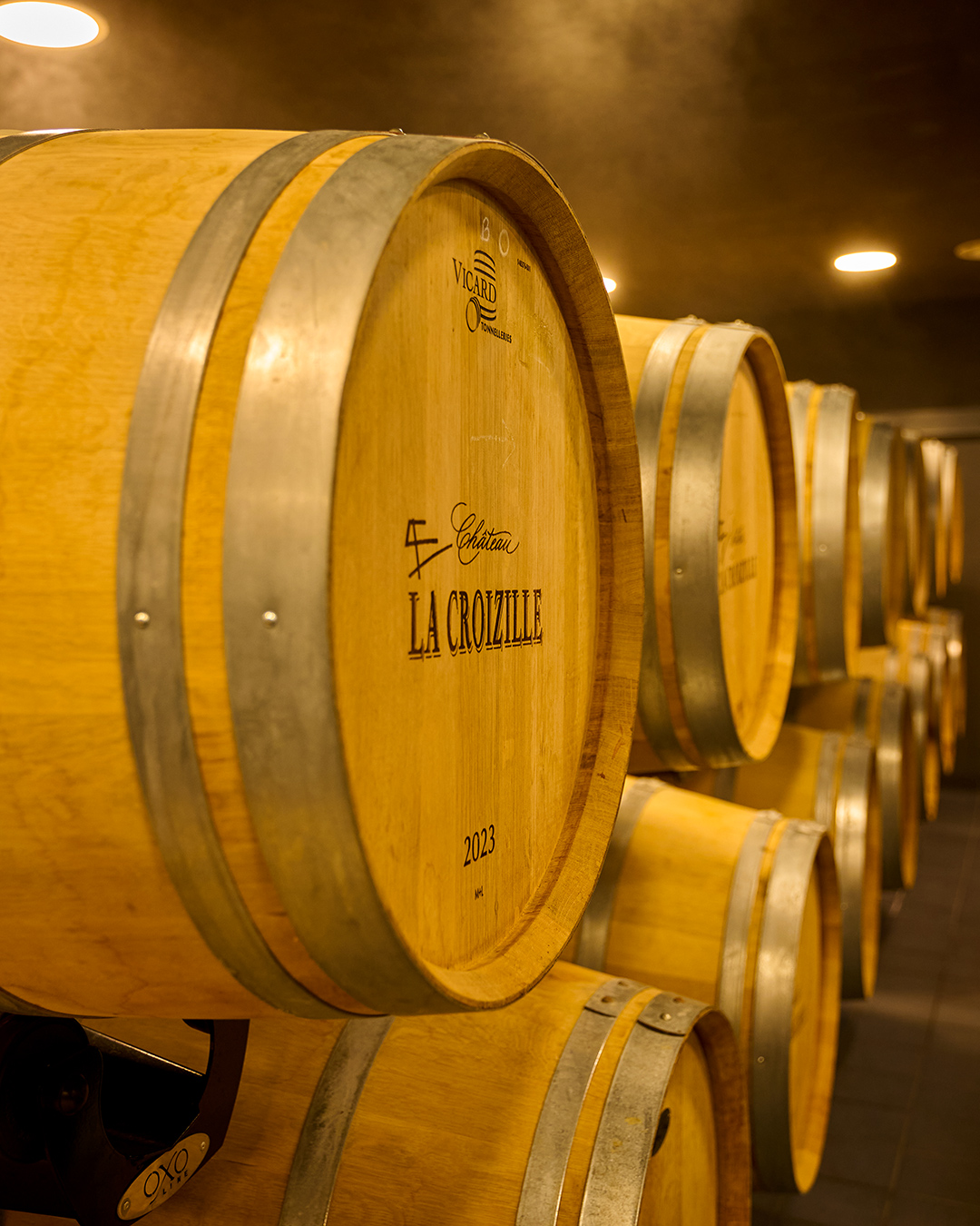 Dans notre chai semi-enterré, creusé dans la roche calcaire, le vin évolue paisiblement, grâce au système OXOline2® qui permet un soin individualisé. La température, l’hygrométrie, la lumière : tout est pensé pour que le vin s’exprime avec justesse, sans jamais être brusqué. Pendant dix-huit à vingt-quatre mois, le vin s’affine, s’arrondit, gagne en profondeur et en élégance.